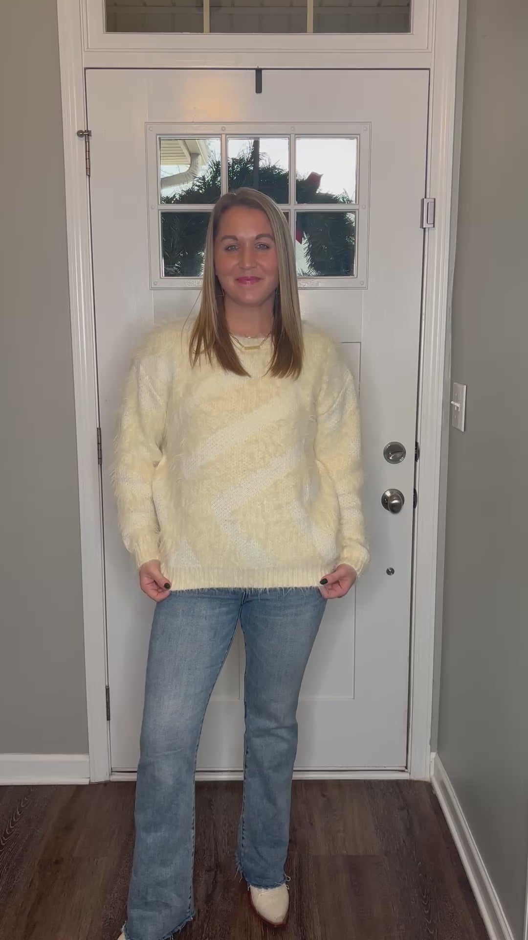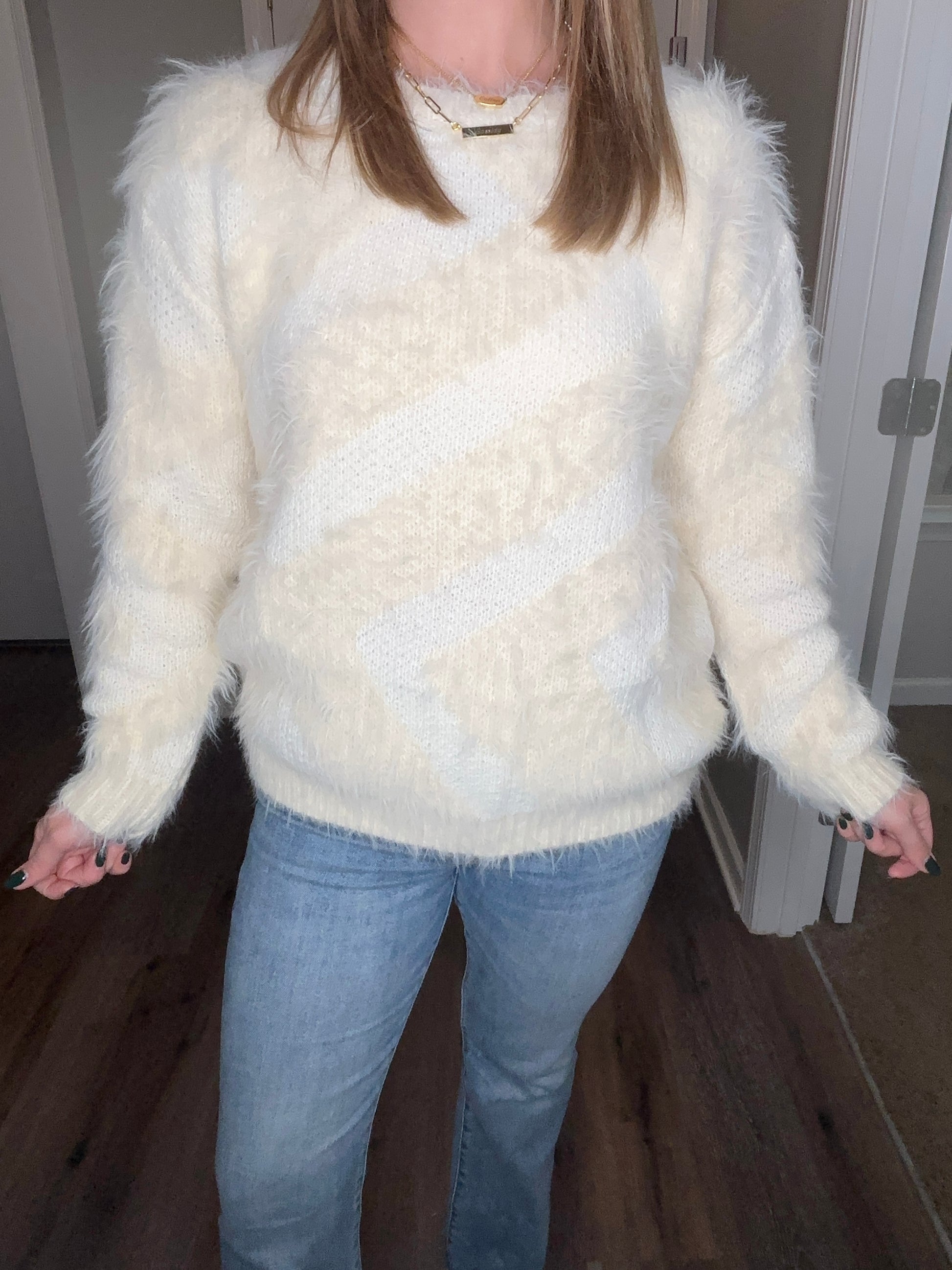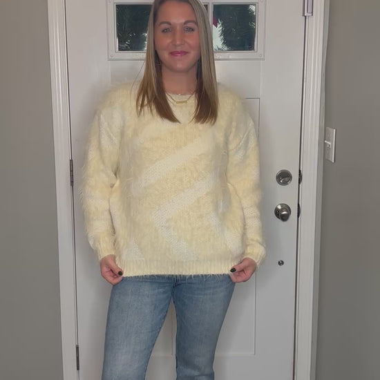 Meet your new cold weather essential. Our Frangipani Faux Fur sweater in cream faux mohair combines a plush, cloud-like feel with a subtle diagonal stripe. The tone-on-tone design brings a modern edge to the classic fuzzy sweater while maintaining its sophisticated versatility and understated luxury, making it easy to pair with satin skirts, structured denim and everything in between. Model is 5’5” and wearing a size small.
