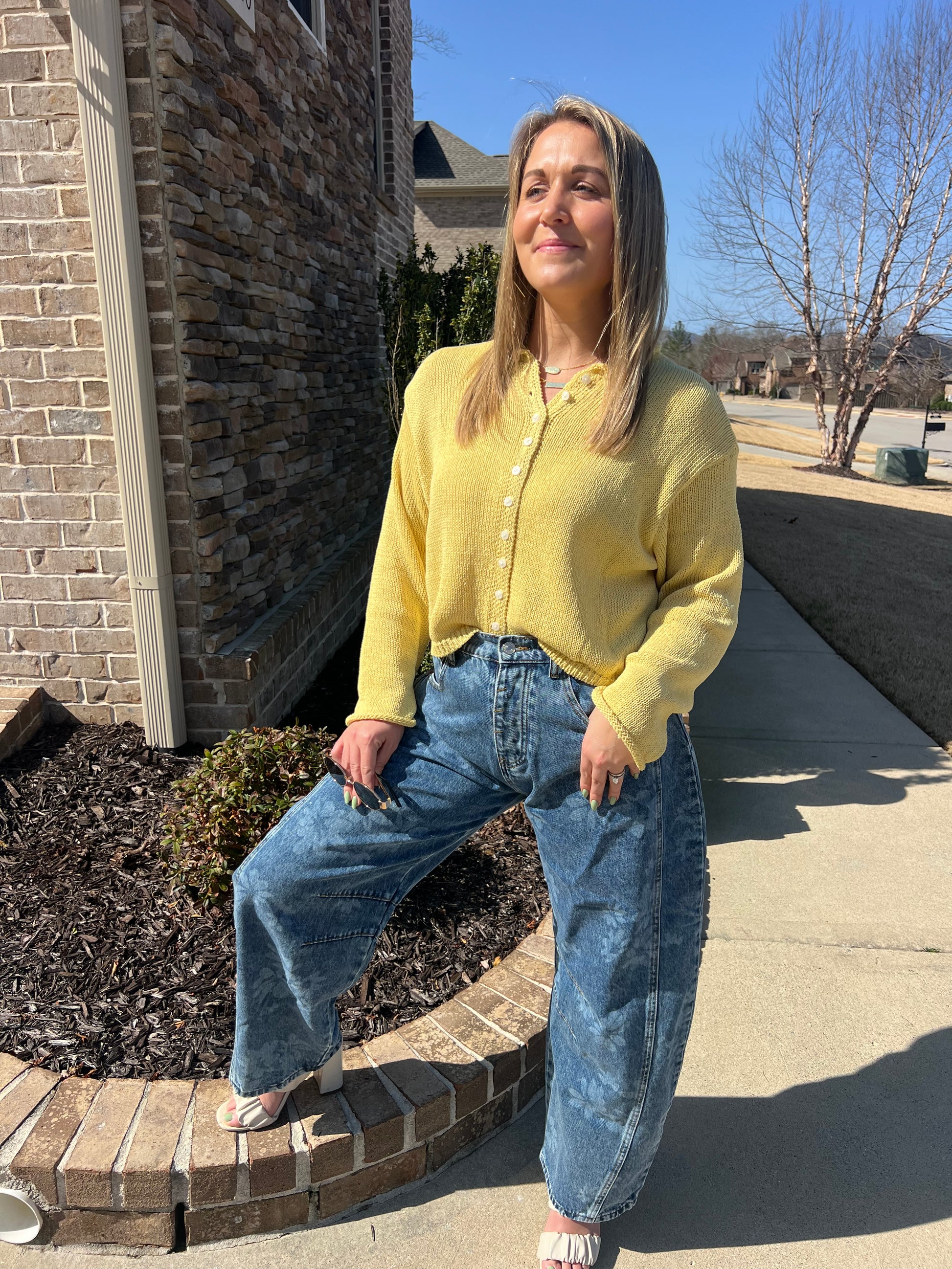 Add a pop of sunshine to your wardrobe with this Goldenrod Lightweight Rolled Collar Cardigan. The vibrant goldenrod hue brings warmth and energy to any outfit, while the soft, lightweight fabric makes it perfect for layering through spring and beyond. The rolled collar detail adds a touch of sophistication to this effortlessly chic essential.